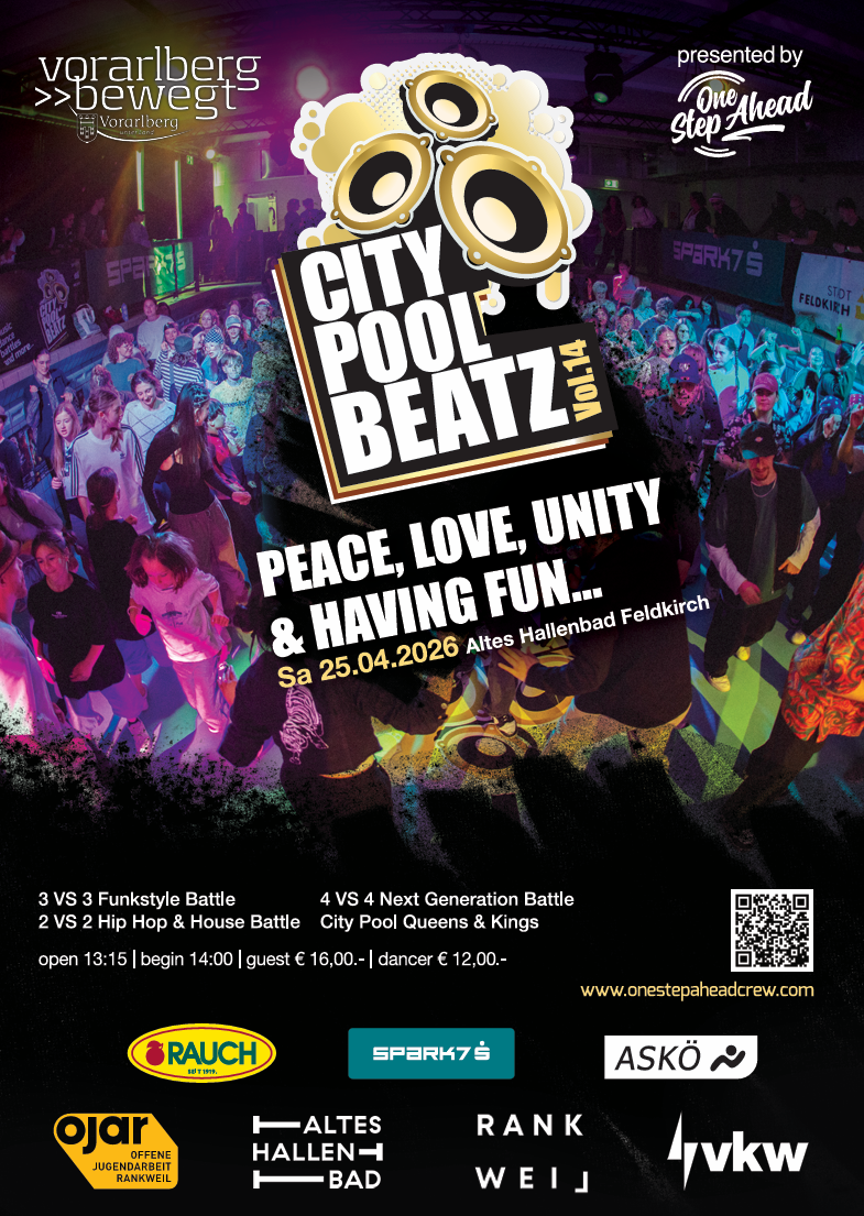 Seit 2010 bietet “City Pool Beatz” jungen Tänzerinnen und Tänzern eine Bühne, um sich im Tanz zu präsentieren. Ursprünglich von 5 Jugendhäusern ins Leben gerufen, übernahm 2014 der Verein “One Step Ahead” das Event und führt es mit voller Leidenschaft weiter.
